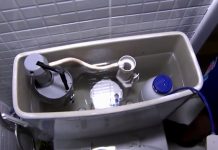 Jovens economizam água no banheiro usando garrafas